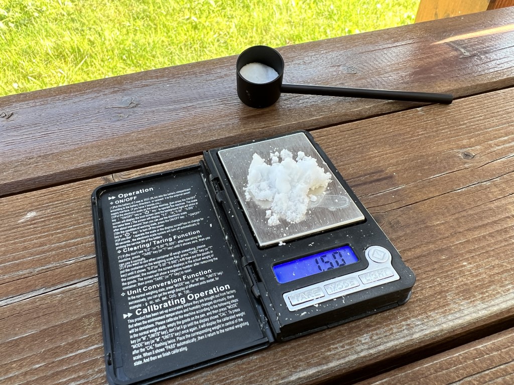 Prepare the oxalic acid: measure about 1–2 g of oxalic acid into each cap using the supplied spoon.