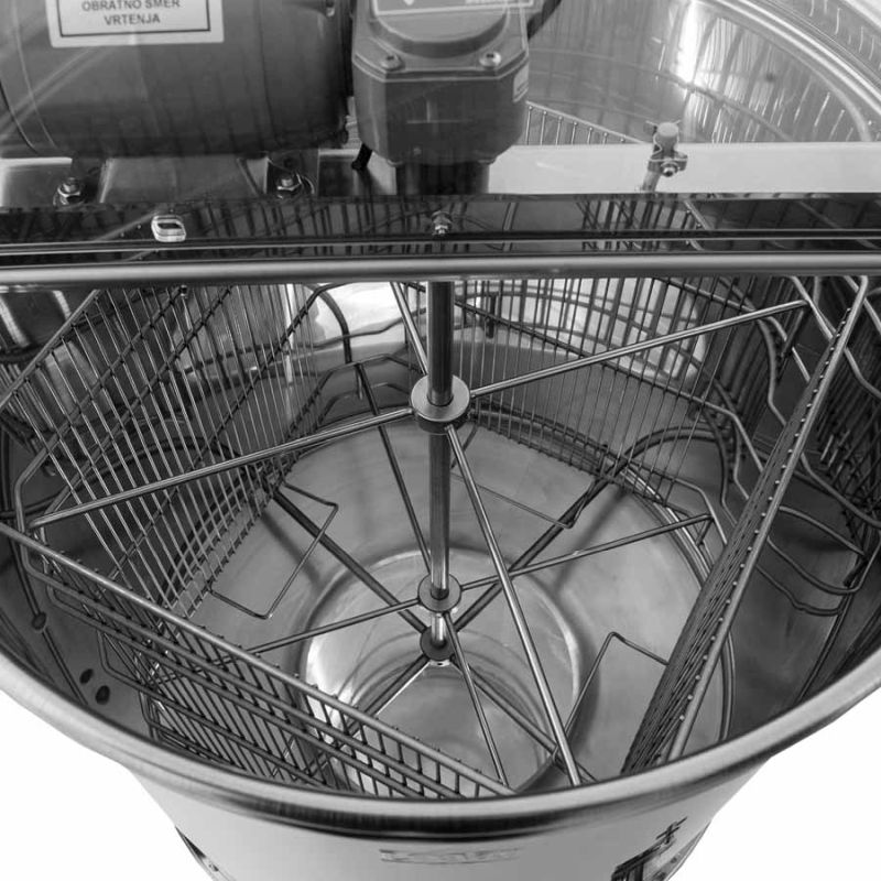 This 4-frame tangential extractor is equipped with a motor drive (110 W / 230 V) with an integrated safety switch that automatically stops the motor when the lid is opened. The extractor is designed without a bottom and sits directly on the straining can, secured with a clamping ring — this prevents tipping and increases stability during extraction. The extracted honey flows directly into the straining can beneath.