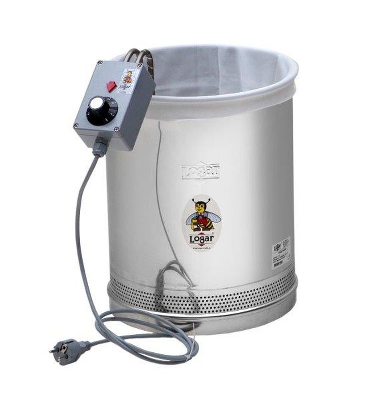 Place a suitable receiving container (internal Ø 30.6–30.8 cm) under the Honeytherm. We recommend Logar filling containers with an internal diameter of 30.7 cm (35, 50 kg). Insert the straining bag into the clarifying vessel, stretch it over the rim and place the heating coil inside. Add the honey so that the lower heating coil is completely covered. Only then set the thermostat to approx. 65 °C.