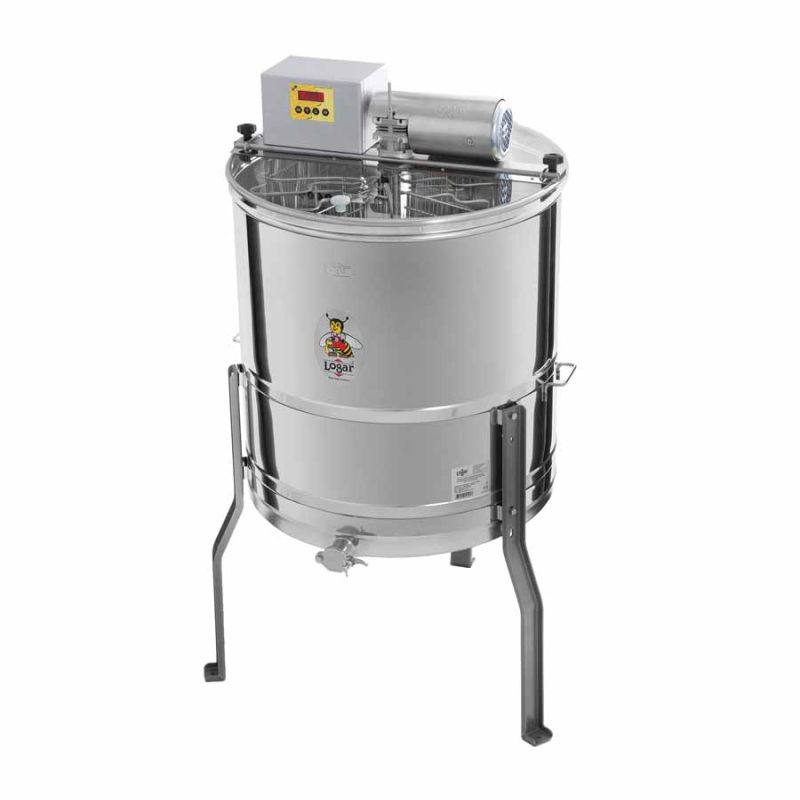 20/8-frame radial honey extractor with a quiet motor drive (110 W / 230 V), fully electronic control and integrated safety device that automatically stops the motor when the lid is opened. State-of-the-art technology is reflected in the seamlessly welded extractor bottom, sloped toward the outlet. The stainless-steel honey tap is welded at the lowest possible point so that all honey can be drained. All parts that come into contact with honey are made from food-grade materials. The lid is made of transparent acrylic. A special base/foot construction ensures excellent stability.
