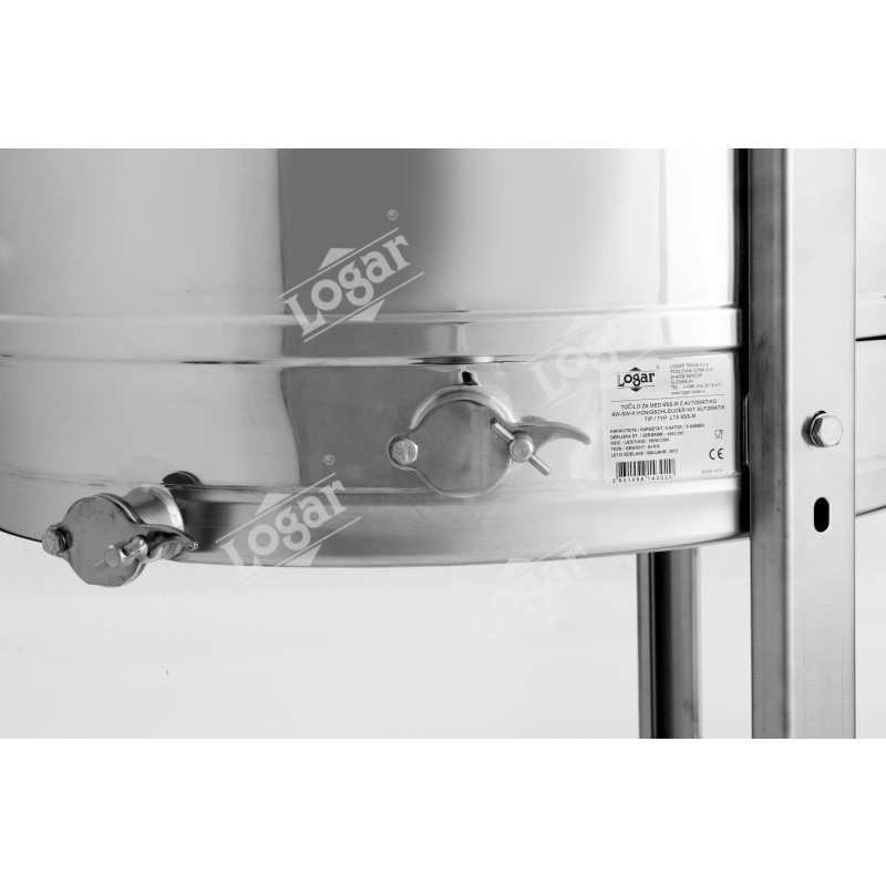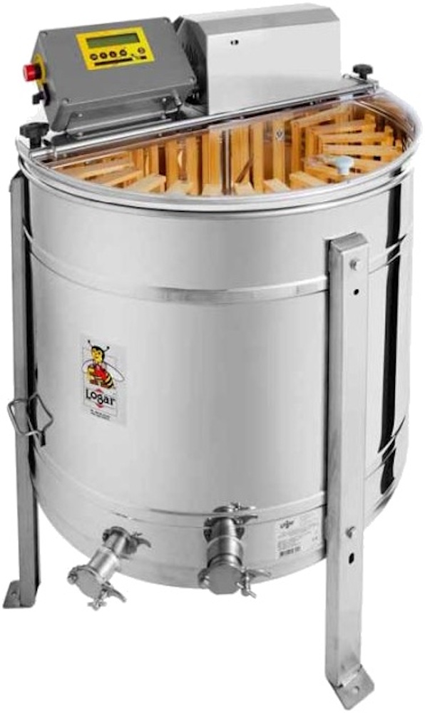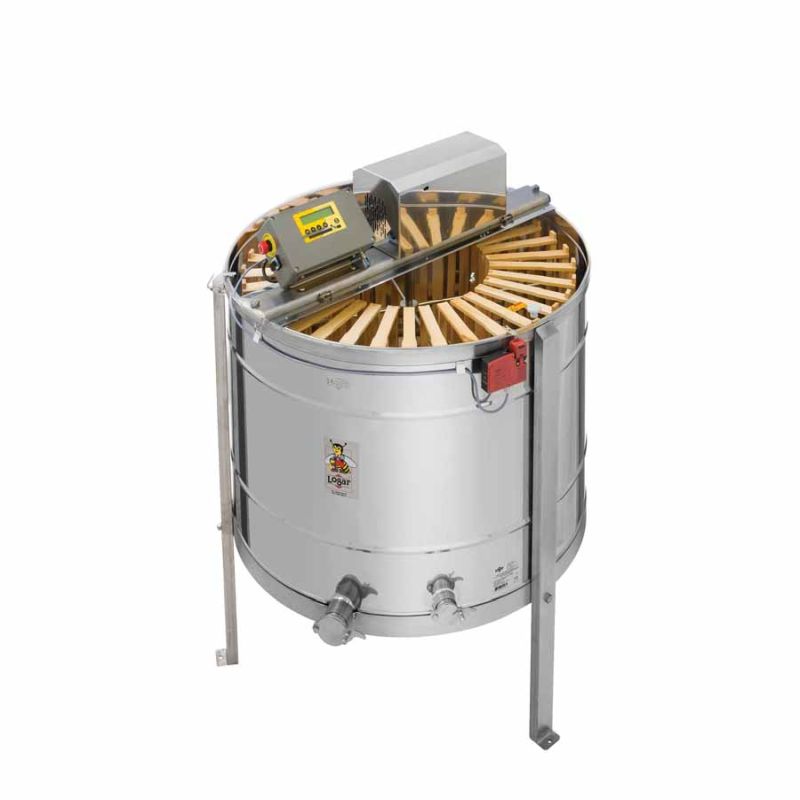 24/12-frame radial honey extractor by Logar, with 180 W / 230 V motor drive, fully electronic automatic control and integrated safety device that automatically shuts off the motor when the lid is opened. State-of-the-art engineering enables an innovative design of the extractor bottom. The drum bottom is seamlessly welded and sloped toward the outlet. The extractor is equipped with two stainless pinch valves 6/4\"; one of them is fitted at the lowest possible point so that all honey can run out of the extractor. All parts that come into contact with honey are made from food-grade materials. The lid is made of transparent acrylic.