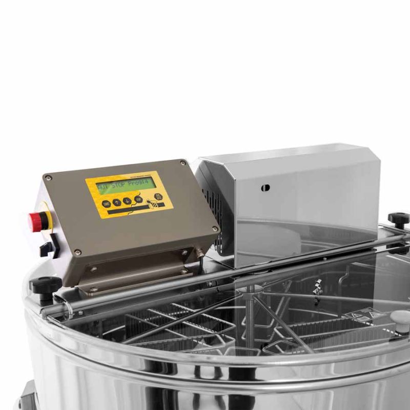 6-frame self-reversing honey extractor with 180 W / 230 V motor drive and fully automatic control. It has an integrated safety switch that automatically shuts off the motor when the lid is opened. State-of-the-art technology allows an innovative design of the extractor floor. The bottom of the drum is seamless welded and sloped toward the outlet. The extractor has two stainless-steel honey valves 6/4", one installed at the lowest possible point so that all honey can flow out of the extractor. All parts that come into contact with honey are made of food-grade materials. The lid is made of transparent acrylic glass.