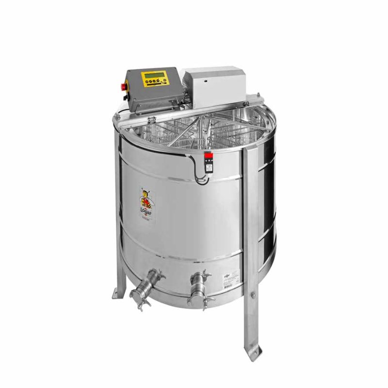 The 8-frame self-reversing honey extractor from Logar (fully electronic) is equipped with a 250 W motor (230 V), a fully automatic control unit and an integrated safety device that automatically stops the motor when the lid is opened. The extractor has two stainless steel pinch valves 6/4'' (Ø 42 mm); one is fitted at the lowest possible point so that all honey can drain from the drum. All parts that come into contact with honey are made from food-grade materials. The lid is transparent acrylic.